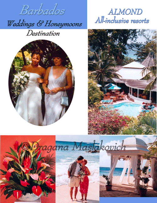She has visited Barabados on several occasions where she usually enjoys her vacation staying at Almond Beach Club & Spa Resort. To learn more about 4 plus star, all-inclusive Almond Beach Resorts and their recently renovated 2 beachfront properties, Almond Beach Club & Spa or the Village contact your local travel agent or visit them online at www.almondresorts.com to find out more about their all-inclusive features. They also offer weddings & honeymoons packages. Booking in advance is recommended. Her travel article on Barbados was recently featured in the Spring/Summer issue, 2005 in the Romance Travel Magazine.