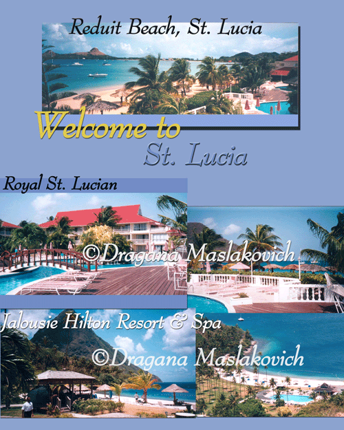 This promotional layout is designed for promotional purposes only to showcase Dragana's photographic and layout design skills which features St. Lucia as a romantic travel destination and showcases several fine resorts available on the island where she had and opportunity to familiarize herself with variety of hotels and resorts that she has visited for a personal inspection during her visit to this beautiful and lush island.