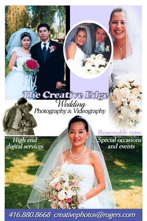 We have expanded our creative services to include wedding photography and videography. We use high end digital format to provide you with the best coverage on your special day. Please call us directly to learn more about our wedding packages and pricing. We can provide you with customized packages based on your wedding photography and videography needs and your budget. We have lots of experience shooting in the GTA and we are familiar with a wide range of different venues, hotels, banquet halls, parks, churches, historic sites and other popular locations for wedding ceremonies and receptions. We are very customer focused and we pride ourselfs with excellent quality services and customers satisfaction.